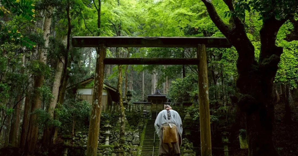 日本の原風景のような山間の静かな集落、竹林や杉林のなかを